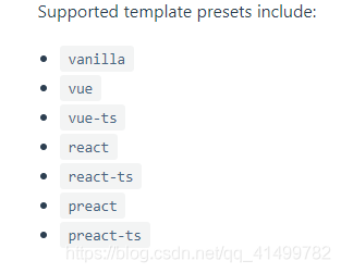 语法: npm init @vitejs/app my-react-app --template react 更多指令 (opens new window),查看官方文档,可以把react 替换成 vue vue-ts 或者是下面图片中的任何一个
