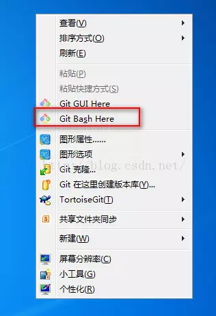 # 2、右键鼠标,选中 “Git Bash here”,当然你也可以在 windows 的 “开始”--->“所以程序”,或者安装目录打开它