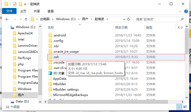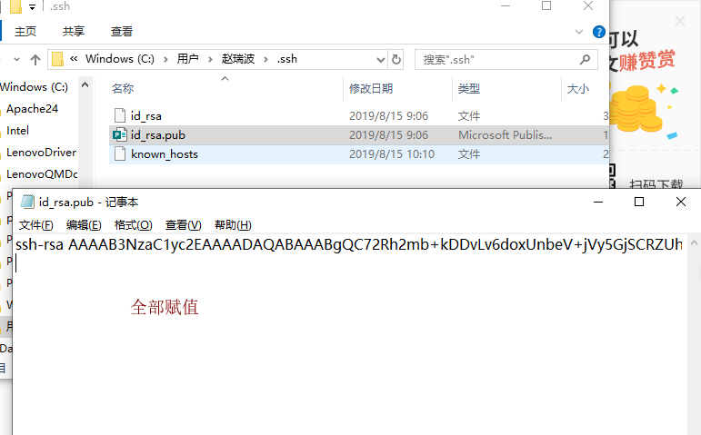 # 6、打开 Admin 目录进入.ssh 文件夹,用记事本打开 id_rsa.pub,复制里面的内容添加到你 github 或者 bitbucket ssh 设置里即可